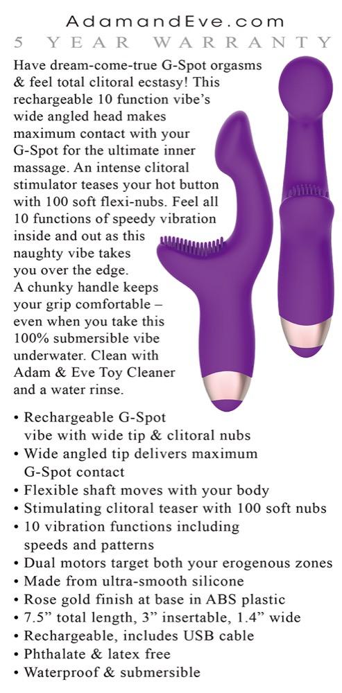 Have dream-come-true G-Spot orgasms & feel total clitoral ecstasy! This rechargeable 10 function vibe’s wide-angled head makes maximum contact with your G-Spot for the ultimate inner massage. An intense clitoral stimulator teases your hot button with 100 soft Flexi-nubs. Feel all 10 functions of speedy vibration inside and out as this naughty vibe takes you over the edge. A chunky handle keeps your grip comfortable even when you take this 100% submersible vibe underwater. Clean with Adam & Eve Toy Cleaner & a water rinse.