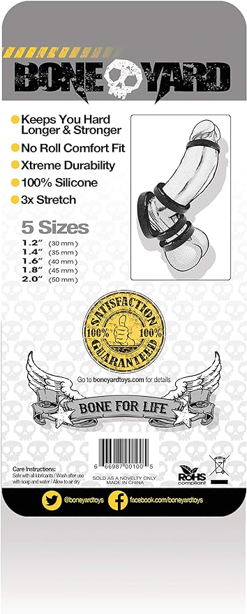 These man toys are designed with superior materials and production, thus increasing both comfort and lifespan. The iconic Boneyard-branded design has a sleek silicone finish and features a superior and durable 3X-stretch. The soft medical grade silicone rings and non-roll design provide a snug fit that both the wearer and his partners will appreciate. Keep you hard longer and stronger. Safe with all lubricants. Package includes five rings: 30mm (1.2 in.), 35mm (1.4 in.), 40mm (1.6 in.), 45mm (1.8 in.), 50mm (2 in.)