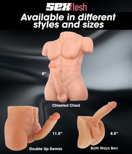 Chiseled Chad has a ripped bod and huge rod! Slightly smaller than life size, he still sports a massive, bendable cock that is textured to please. His veined, girthy shaft is over 8 inches of hot, throbbing cock that is ready and waiting for some attention. You can impale yourself on his dick or ream his tight pink asshole, it is up to you! With a firm core wrapped in a soft outer layer, he has strategic softness and hardness in all the right places, for the ultra realistic feel of flesh sliding over taut muscle. A flat base lets you pound as hard as you want, and his smaller size allows him to be moved and stored with ease. A ribbed anal tunnel and through hole makes Chad easy to use and clean.