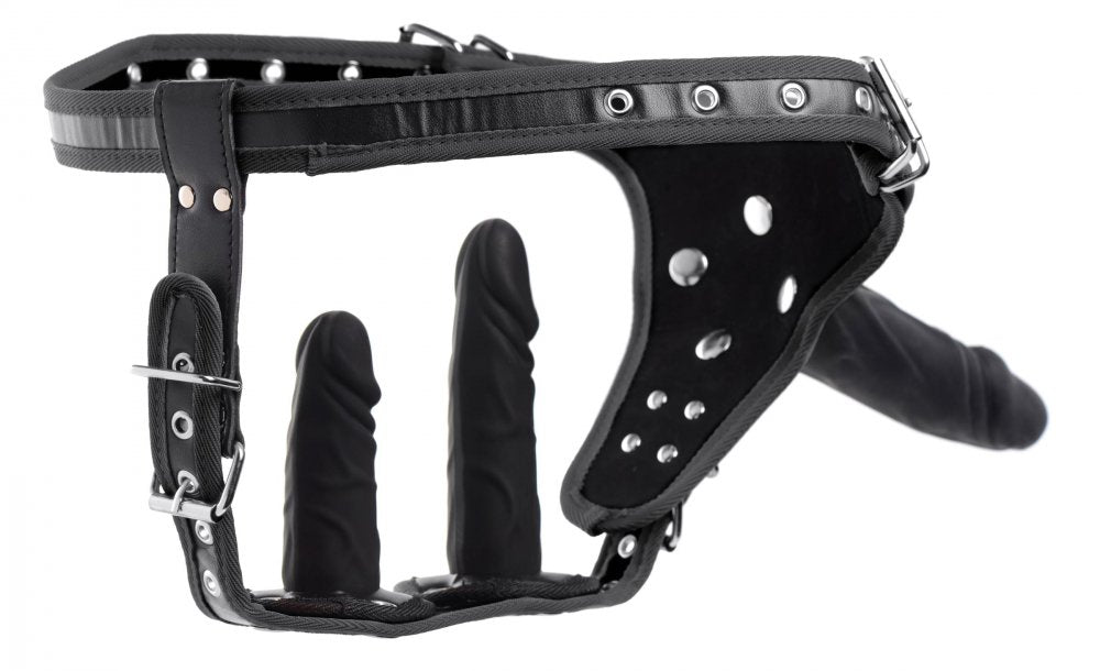 Enjoy feeling completely penetrated as you peg your partner! This harness has three detachable dildos that can penetrate the wearers anus and or vagina while also having one at the front for pegging their partner. A bonus feature includes being able to swap out dildo sizes and rearrange the configuration to customize and best suit the couple.
