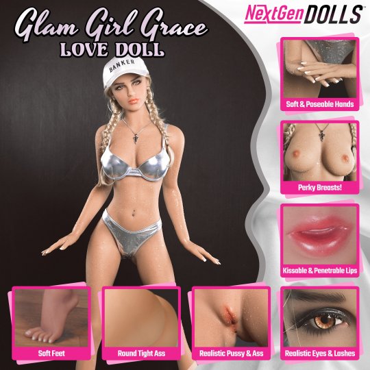 Bring home the Glam Goddess Grace and you'll have your very own influencer, fashion icon, or model to enjoy and play with! Grace is a Johnsonsden Exclusive doll who is designed to make your dreams come to life! She's built with a realistic body of TPE and stainless steel armature that allows you to touch her and feel her soft skin while posing her in countless positions! From her head to her toes, she's designed to pleasure you. Her oral, anal and vaginal love canals are textured with little nubs that grip and massage your shaft as you thrust into her. Her petite and athletic body is perfect for grabbing and lifting into positions where you can ride her or have her ride on top of you with ease. Dress her up in the latest fashions and keep her happy by taking pictures of her in each new style. She comes with a baby doll lingerie and G-string set, a comb, a mani-pedi kit for her nails, and the long, braided, platinum blonde wig you see her pictured with. To further enjoy her, she also comes with a warming stick and a vibrating bullet.