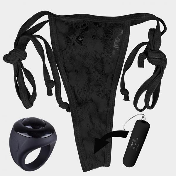 Vibrating bullet, powered by a remote control that looks like an ordinary finger ring, fits discreetly into a side tie lace panty to keep it in place. Panty fits up to 60 inches waists and is discreet enough to wear under clothing while out on the town. Allows couples to play in public, even up to 50 feet away. The remote control makes it easy to shuffle through 10 different vibration functions that tease, please and titillate with the touch of a button. Batteries can be changed on both the remote and bullet.