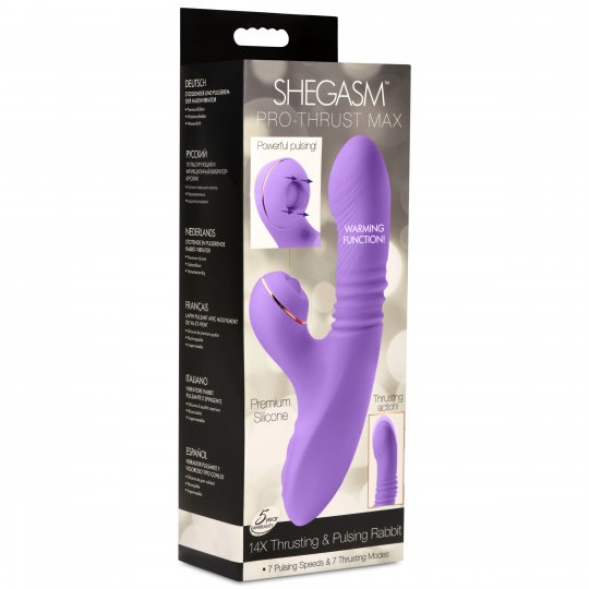 Get ready for the ultimate pleasure experience with the Pro-Thrust Max 14X Thrusting and Pulsing Silicone Rabbit. With its unique "she gasm" feature and powerful pro thrust capabilities, this toy will take your pleasure to new heights. Say goodbye to dull and hello to intense orgasms!