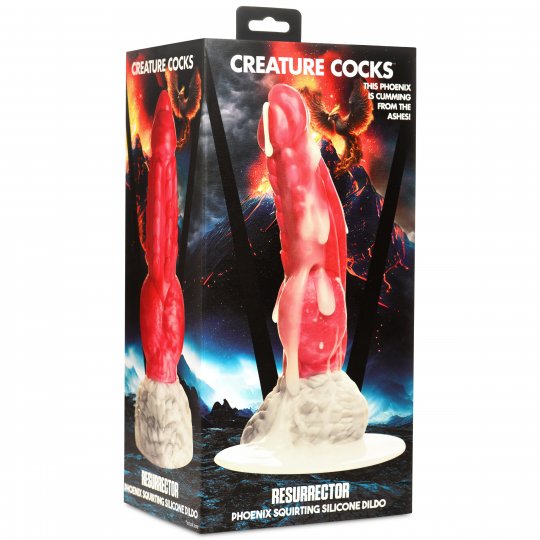 Fulfill your fantasies by filling yourself up with explosive, squirting fluids from this thick, Resurrector Phoenix dildo! This thick pheonix dong has a red shaft and white base. The tapered tip of the head makes insertion easy. The ropey muscles and rows of bumps and beads, plus the fat knot above the base make this a wild ride that will get you to fall and rise again and again, just like the phoenix! Made out of premium, phthalate-free silicone this rod is body-safe and best used with water-based lubricants. A syringe and hose connect to the base so you can fill up the syringe with your lube of choice and then inject it into the hollow tube inside the dildo for an explosive, squirting experience that fills you up from within!