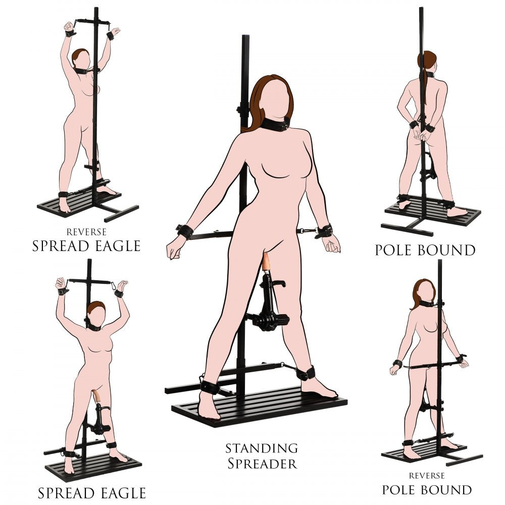 Have your submissive partner stand and take it or lock yourself in for a seriously unique and intense pounding! This Ultimate Enforcer Orgasm Tower comes with a removable sex machine and provides the full package for dungeon torment and pleasure! This full set includes 1 tower, 1 sex machine, 2 premium silicone dildos, 1 collar, 2 wrist cuffs, 2 ankle cuffs, 5 carabiners, 1 fixed base with dildo adapter, 1 adjustable base with dildo adapter, 1 D-ring adapter. Made out of sturdy, strong, steel, the tower is easy to put together and has adjustable height and width! Adjust the width of the ankle or wrist bars, the height of the collar, and the height of the sex machine so you can enjoy custom sizing for anyone who is locked up! On the tower are 5 D-ring attachment points. Use the wrist cuffs on either side of the wrist bar to keep their hands and arms from moving. Use the ankle cuffs provided to spread their legs no matter how hard they get pounded. Attach their collar to the center attachment point to keep them from moving their head and neck. Once they're all strapped in, enjoy the powerful thrusting of the sex machine and tease and torment them as they're restrained! Have some fun and use both dongs on them at once! When you connect both of the base adapters, you can try out double penetration!